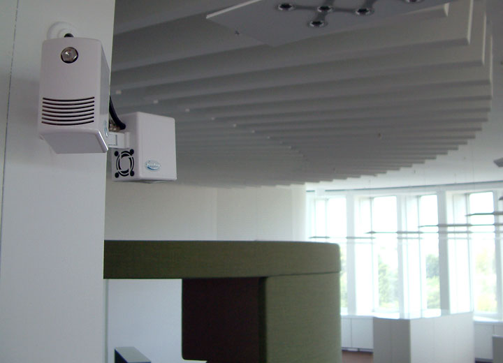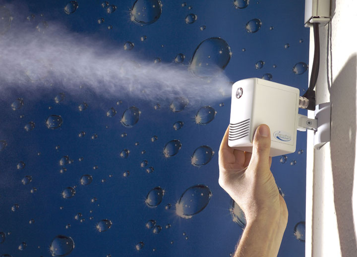 The system consists of a reverse osmosis (RO) water treatment system that removes the minerals from the supply water, a high pressure pump, the in-room nozzles, hygrostats and a central control panel.