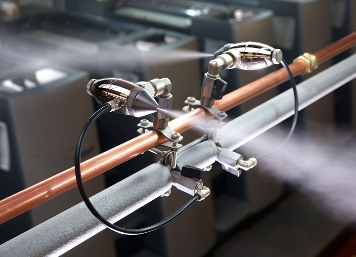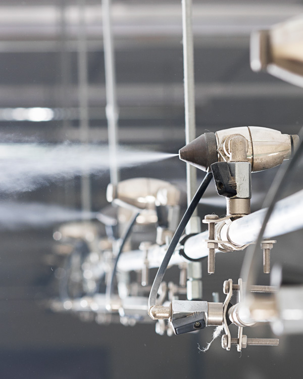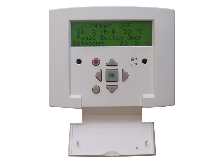 The JetSpray provides very accurate humidity control directly to a room's atmosphere using a combination of compressed air and water. A series of strategically located nozzles provide consistent humidity throughout the space.